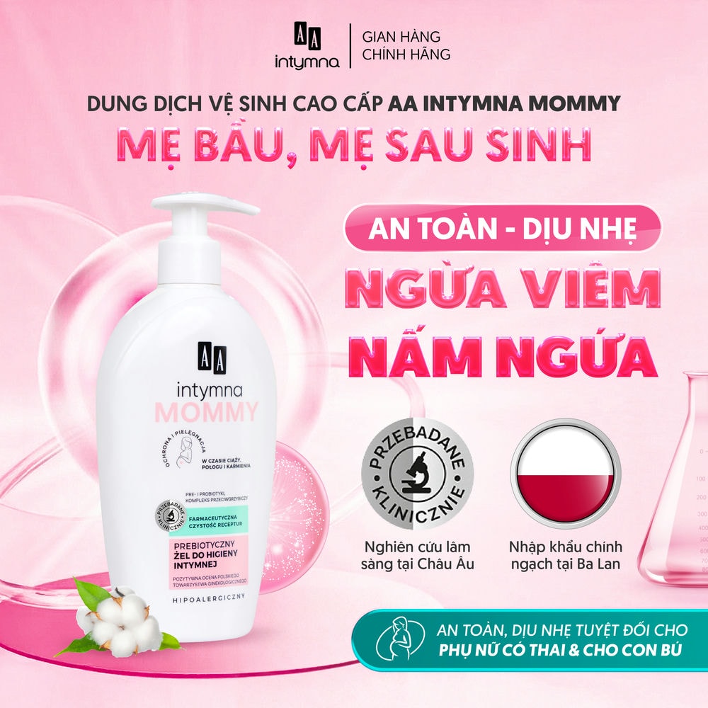 Dung dịch vệ sinh cao cấp AA Intymna Mommy được bào chế theo chuẩn dược phẩm và kiểm nghiệm da liễu Châu Âu, an toàn tuyệt đối cho phụ nữ mang thai và sau sinh. Sản phẩm với Probiotic – Prebiotic, Acid Lactic và phức hợp kháng nấm giúp cân bằng hệ vi sinh, duy trì pH, giảm mùi và ngăn ngừa viêm ngứa. Hoạt chất Lauryl Glucoside tạo lớp bọt mịn, làm sạch nhẹ nhàng, kết hợp chiết xuất hạt bông và Glycerin cung cấp độ ẩm. Panthenol và Allantoin giúp làm dịu kích ứng, hỗ trợ tái tạo và phục hồi vùng da nhạy cảm.
