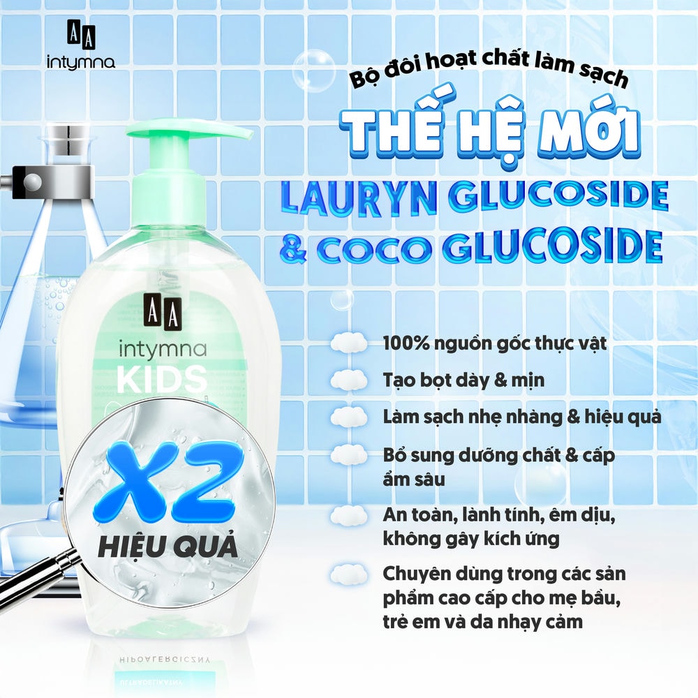Công thức AA Intymna Kids được phát triển chuyên biệt cho làn da nhạy cảm của trẻ em, ứng dụng bộ đôi hoạt chất làm sạch thế hệ mới: Lauryl GlucosideCoco-Glucoside. Đây là hệ làm sạch độc quyền, 100% nguồn gốc thực vật, mang lại khả năng làm sạch tối ưu nhưng vẫn duy trì sự dịu nhẹ cần thiết cho làn da non nớt của bé.